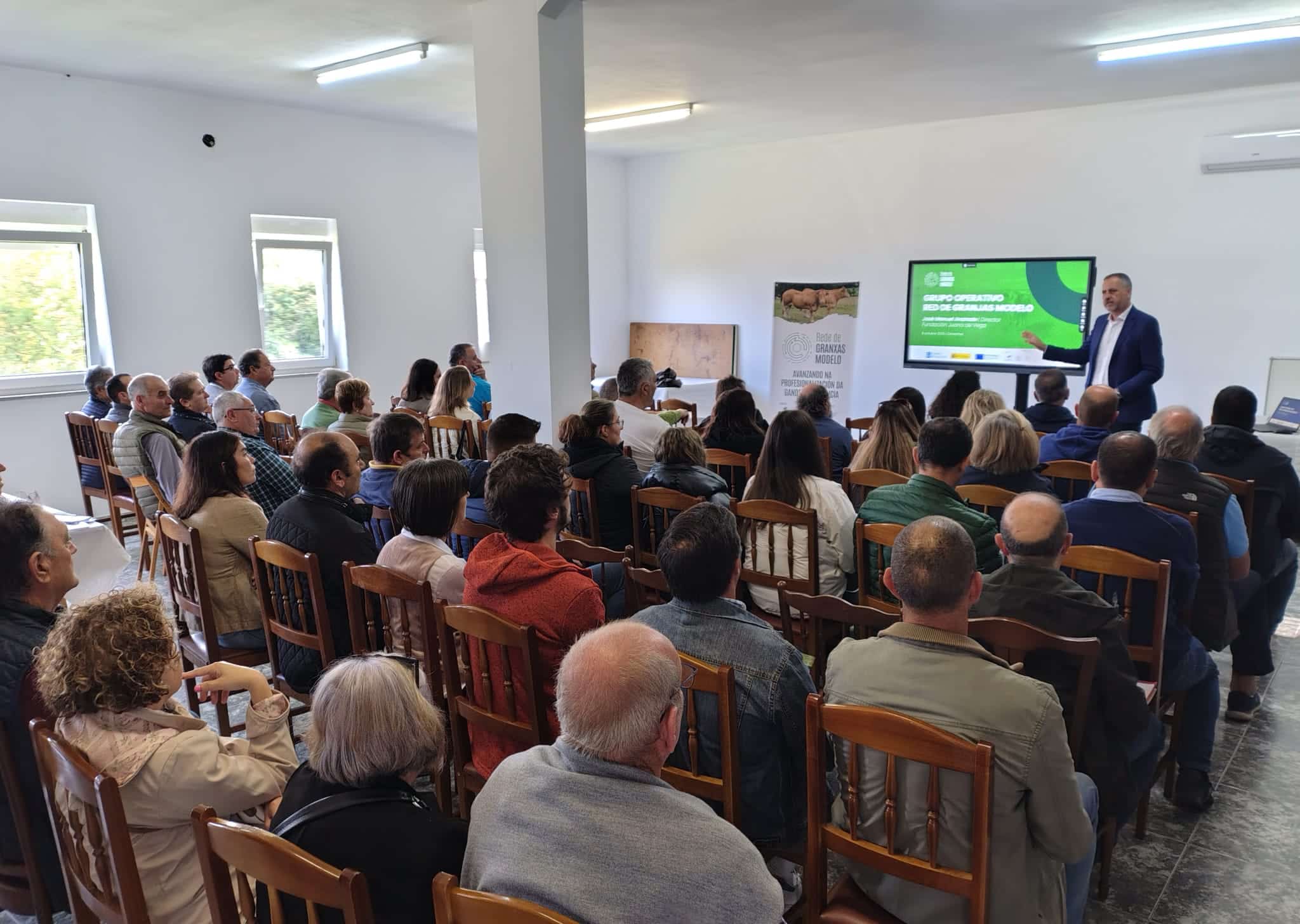 Gandeiros de Cantabria coñecen de primeira man o modelo de produción galego nunha visita técnica organizada polo GO Rede Galega de Granxas Modelo 17 Outubro 2025 Entre o 7 e o 9 de outubro, o Grupo Operativo Granxas Modelo, a través da Fundación Juana de Vega, organizou unha visita técnica coa participación duns trinta gandeiros pertencentes á Indicación Geográfica Protegida (IGP) Carne de Cantabria. A comitiva desprazouse a Galicia co obxectivo de afondar no modelo produtivo galego e coñecer o funcionamento da IXP Ternera Gallega, a de maior volume de produción en España. Durante os tres días de duración da visita, os asistentes puideron coñecer de primeira man o sistema de trazabilidade da IXP Ternera Gallega, visitando explotacións nas que se explicou o proceso de identificación dos becerros e os requisitos para formar parte desta marca de calidade recoñecida a nivel estatal. A estadía coincidiu ademais coa celebración dunha xornada técnica en San Román de Cervantes, organizada polo propio Grupo Operativo. Neste encontro analizouse a situación actual do sector do vacún de carne e déronse a coñecer os resultados dos estudos de custos realizados no marco da Rede de Granxas Modelo. A visita incluíu tamén unha aproximación ao sector lácteo galego. Primeiro, cunha visita guiada á granxa ecolóxica Casa Grande de Xanceda, exemplo destacado de innovación e sostibilidade no rural galego. Despois, achegándose ao Centro de Investigacións Agrarias de Mabegondo (CIAM, Xunta de Galicia), onde puideron coñecer o labor investigador que se está a realizar en Galicia sobre este sector. Rubia Galega Outro dos puntos de interese foi a posta en valor da raza Rubia Galega, símbolo da identidade gandeira de Galicia. Neste sentido, o grupo realizou varias visitas a explotacións especializadas, entre as que destacou a Finca Villadangos, centrada na recría de animais de alto valor xenético desta raza autóctona. Completando o programa, os participantes tiveron ocasión de coñecer parte do patrimonio cultural galego con visitas á cidade de Santiago de Compostela e á aldea prerromana de Piornedo (Lugo), espazos que contribuíron a ofrecer unha visión máis ampla do territorio e da súa riqueza histórica e paisaxística. Suscríbete á nosa newsletter! Non perdas as novas sobre o proxecto de Rede de Granxas Modelo! Suscríbete á nosa newsletter cuatrimestral para estar ao tanto dos nosos avances. Cubre o seguinte formulario. Non puidemos validar a túa subscripción. Estás subscrito á newsletter do GO Rede Galega de Granxas Modelo! Lin e entendo o aviso legal, así como a política de privacidade e acepto recibir comunicacións nformativas e divulgativas do Grupo Operativo Rede de Granxas Modelo a través de email e mediante esta newsletter. ENVIAR